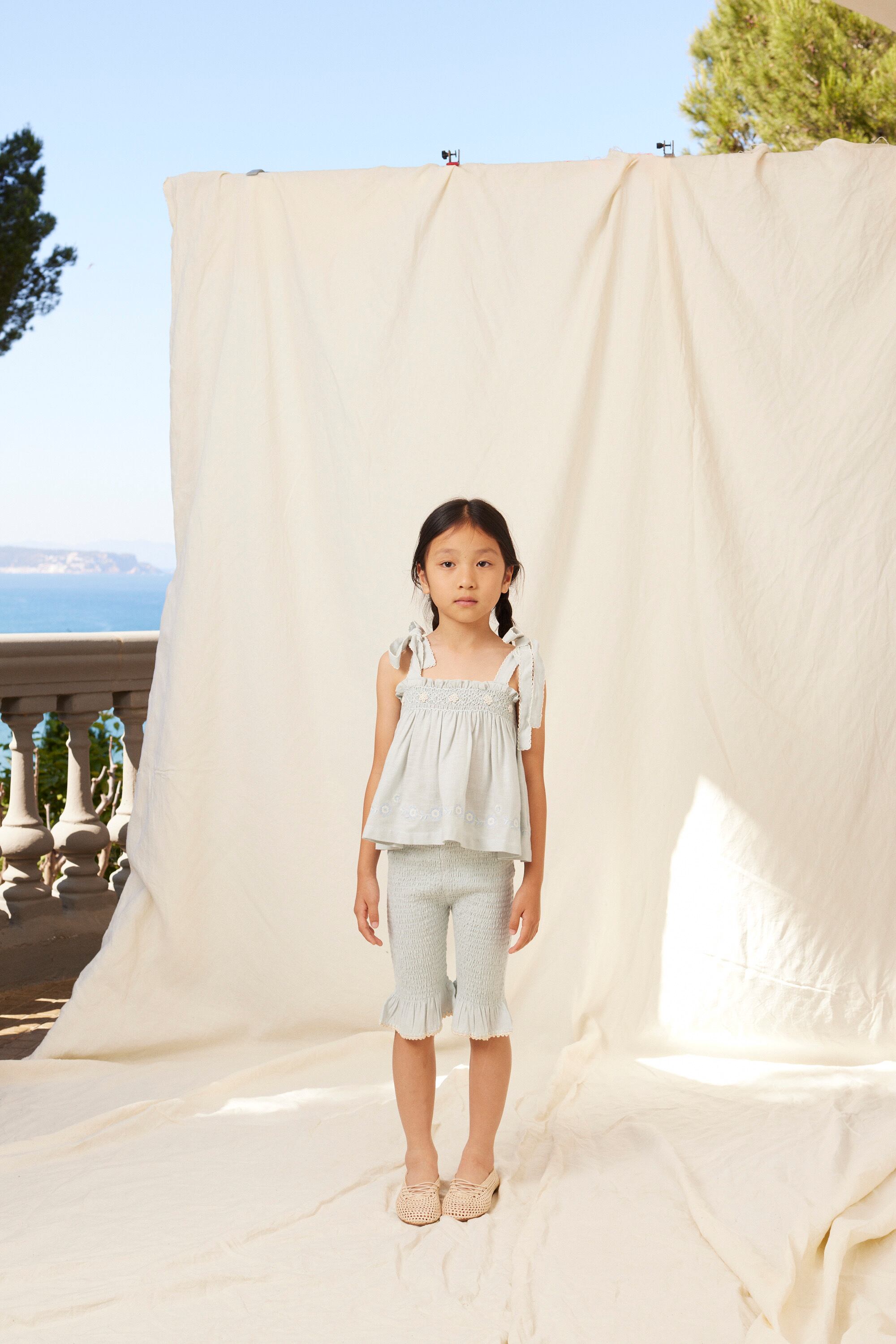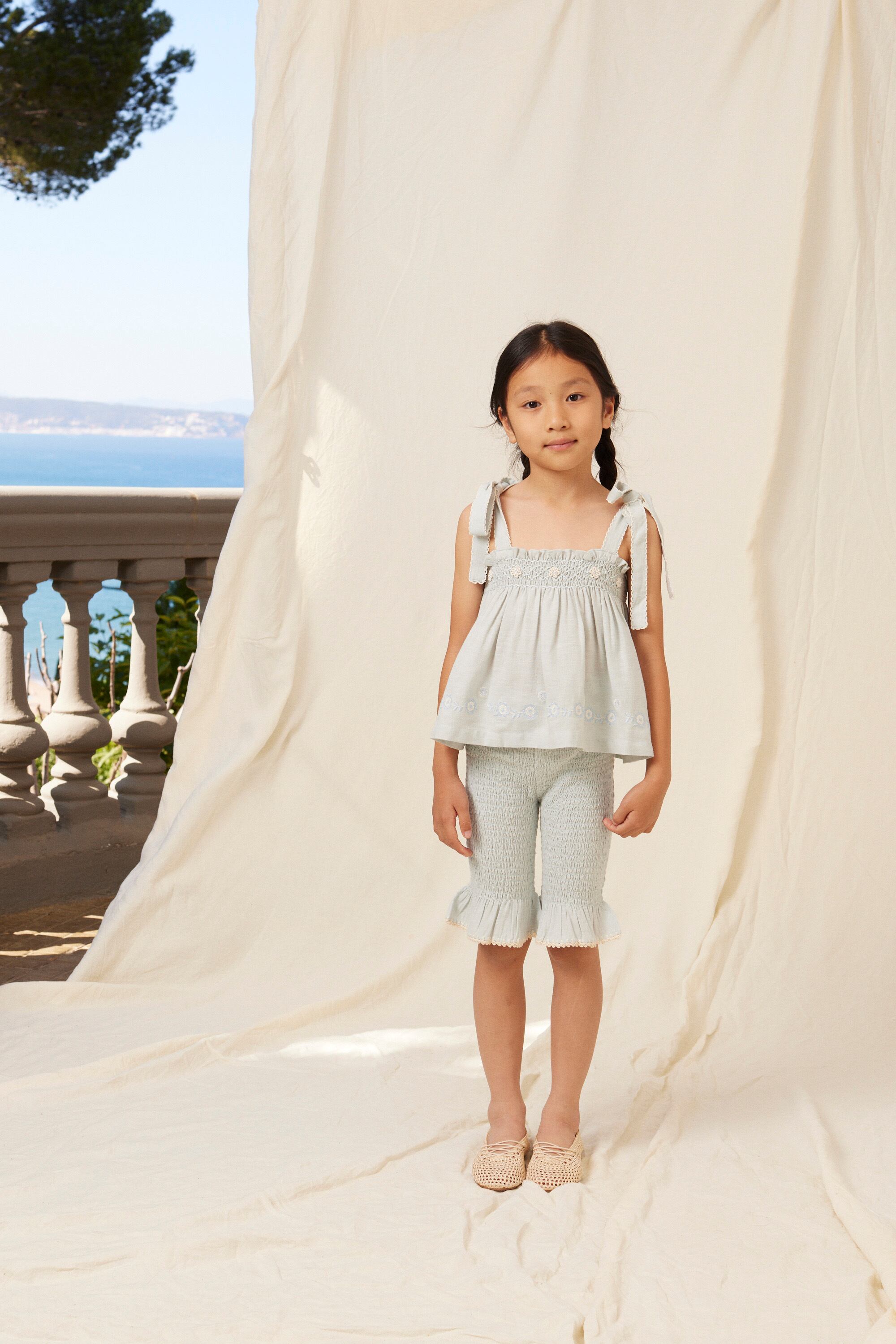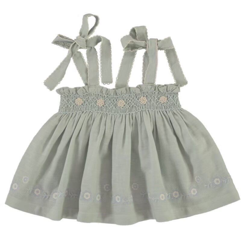 トップスは、ゆったりとしたシルエット、結び付けられたショルダーストラップ、そして手作りの花柄刺繍が施されたスモックチェストが特徴です。