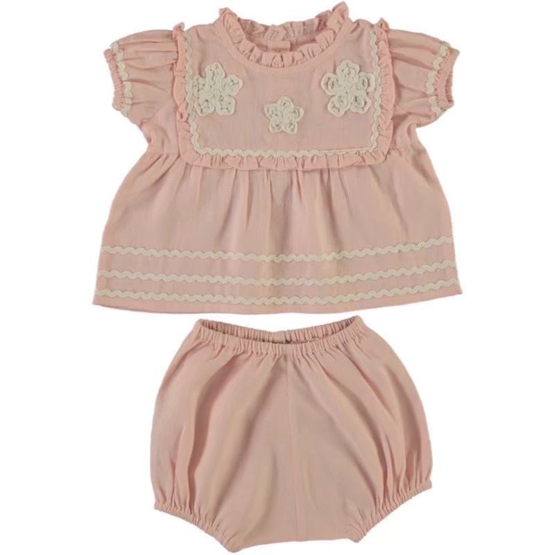 このトップは胸部と襟に柔らかなフリルディテールが施され、パフスリーブが付いており、かわいらしいバルーンブルマが付属しています。